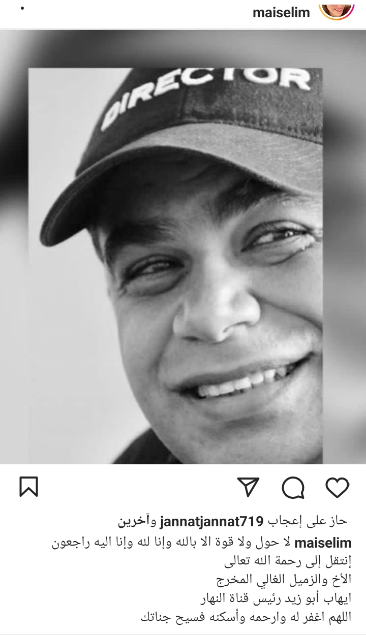كتبت مي سليم، منشورا عبر حسابه الشخصي بموقع انستجرام، جاء فيه: لا حول ولا قوة الا بالله وانا لله وانا اليه راجعون، انتقل الي رحمة الله تعالي الأخ والزميل الغالي المخرج إيهاب أبو زيد، رئيس قناة النهار، اللهم أغفر له وارحمه واسكنه فسيح جناته.
