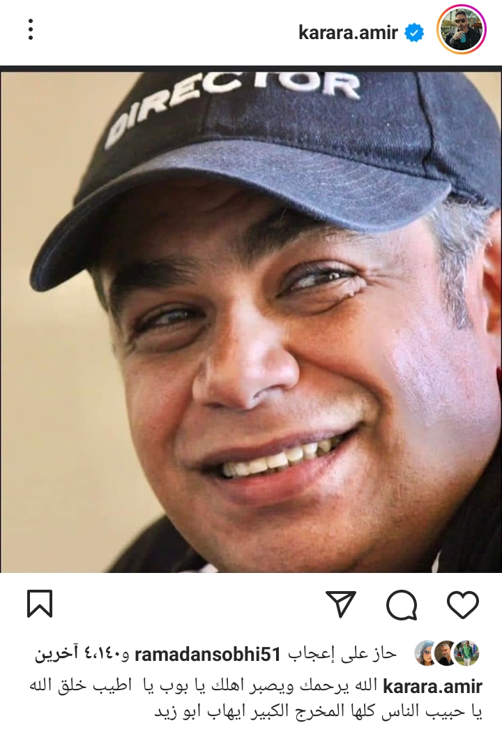 بينما نشر أمير كرارة، صورة للمخرج إيهاب أبو زيد، عبر حسابه الشخصي بموقع انستجرام، وعلق عليها قائلا: الله يرحمك ويصبر أهلك يا بوب، يا اطيب خلق الله يا حبيب الناس كلها، المخرج الكبير إيهاب أبو زيد.