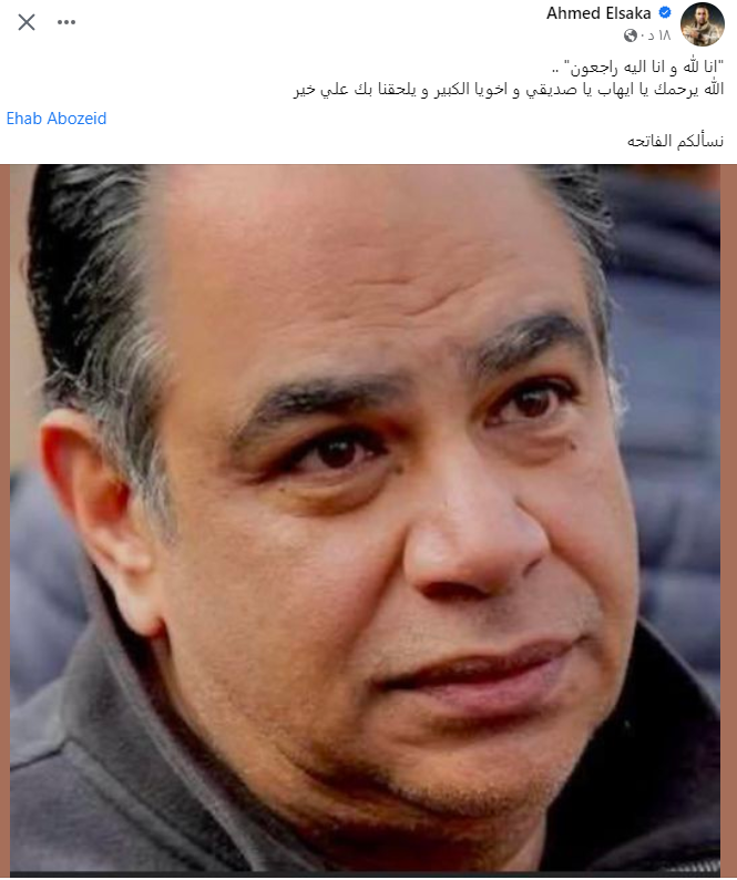 كتب أحمد السقا منشورًا، ينعى فيه الراحل إيهاب أبو زيد، غبر حسابه الشخصي بـ فيس بوك قال فيه: إنا لله وإنا إليه راجعون.. الله يرحمك يا إيهاب يا صديقي وأخويا الكبير ويلحقنا بك على خير.
