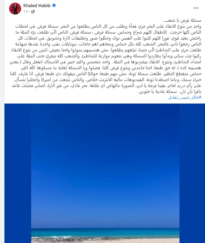 وقال الدكتور خالد حبيب في بوست كتبه على فيسبوك: واحد من بتوع الإنقاذ على البحر جري فجأة، وطلب من كل الناس يطلعوا من البحر، ونادى سمكة قرش، في لحظات الناس كلها خرجت، الأطفال كلهم صراخ وحماس، سمكة قرش.. سمكة قرش.