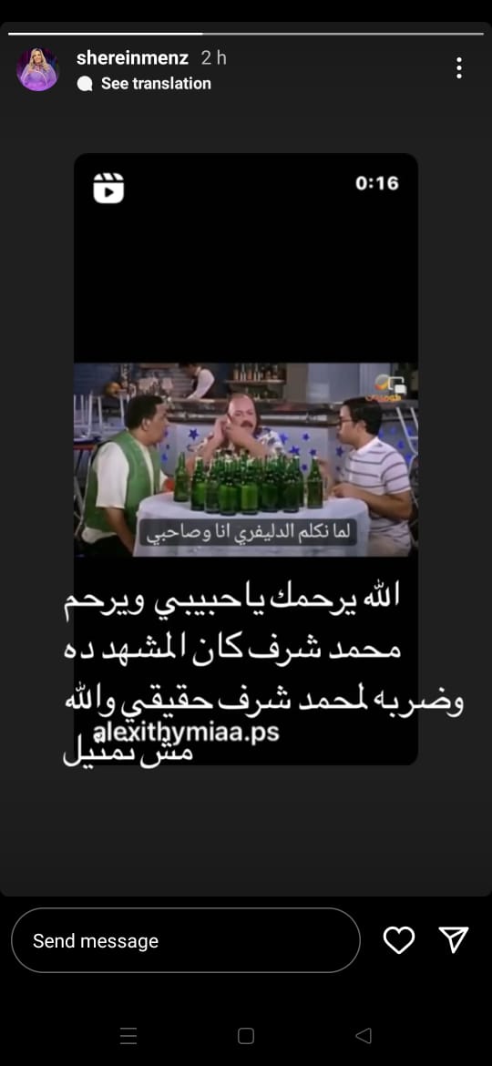 وشاركت شيرين المنزلاوي مشهدا من فيلم قصة الحي الشعبي، وذلك عبر ستوري حسابها الشخصي بموقع تبادل الصور والفيديوهات إنستجرام، وعلقت قائلة: الله يرحمك يا حبيبي ويرحم محمد شرف، كان المشهد ده وضربه لمحمد شرف حقيقي والله مش تمثيل.
