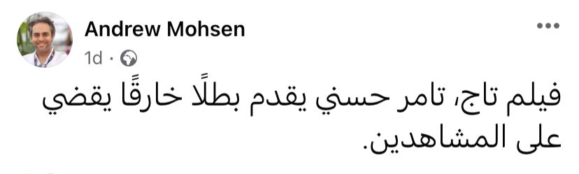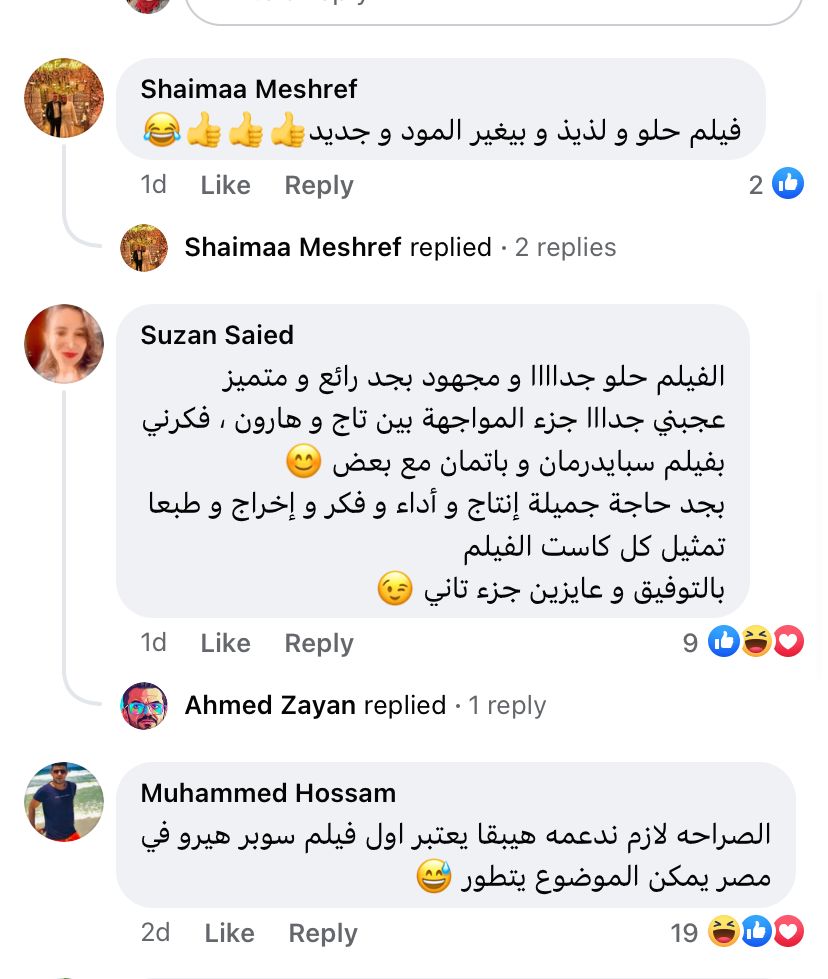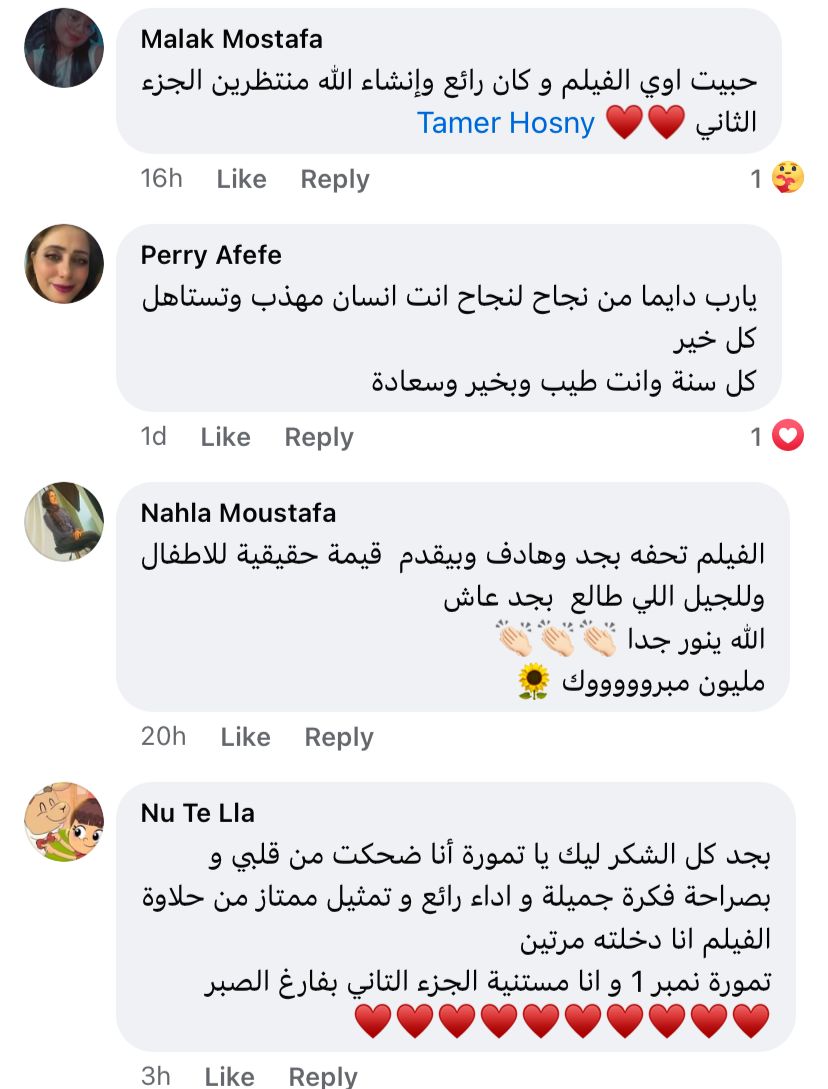 وجاء ذلك ردًا على إحدى متابعيه التي كتبت له: بابا أول مرة يدخل السينما من 30 سنة وطبعا بعد ما فضلنا نلح عليه نخرج أول يوم العيد وطبعا روحنا شوفنا الفيلم بتاعك ولقينا بابا انهبر بالفيلم وبأدائك الجميل وضحك ضحك قمر ربنا يديمه عليه نعمة، شكرا يا تمورا على الفيلم القمر ده بكل تفاصيله الحلو الفيلم ياخد تقييم ١٠.٠٠٠ من ١٠٠٠ فيلم رائع منتظرين جزء تاني.