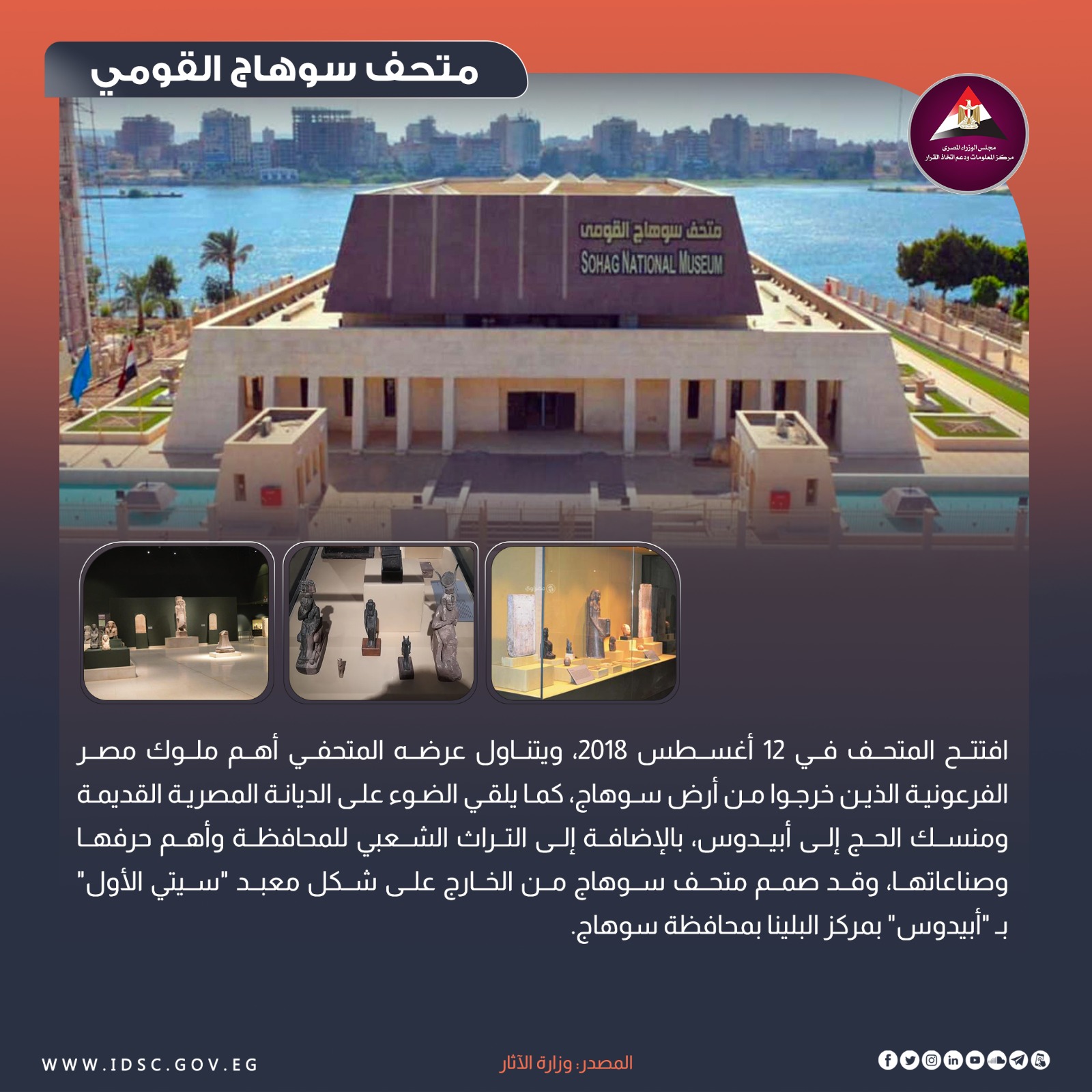 كشف مركز المعلومات ودعم اتخاذ القرار التابع لـ مجلس الوزراء، أن متحف سوهاج القومي افتتح في 12 أغسطس 2018، ويتناول عرضه المتحفي أهم ملوك مصر الفرعونية الذين خرجوا من أرض سوهاج.