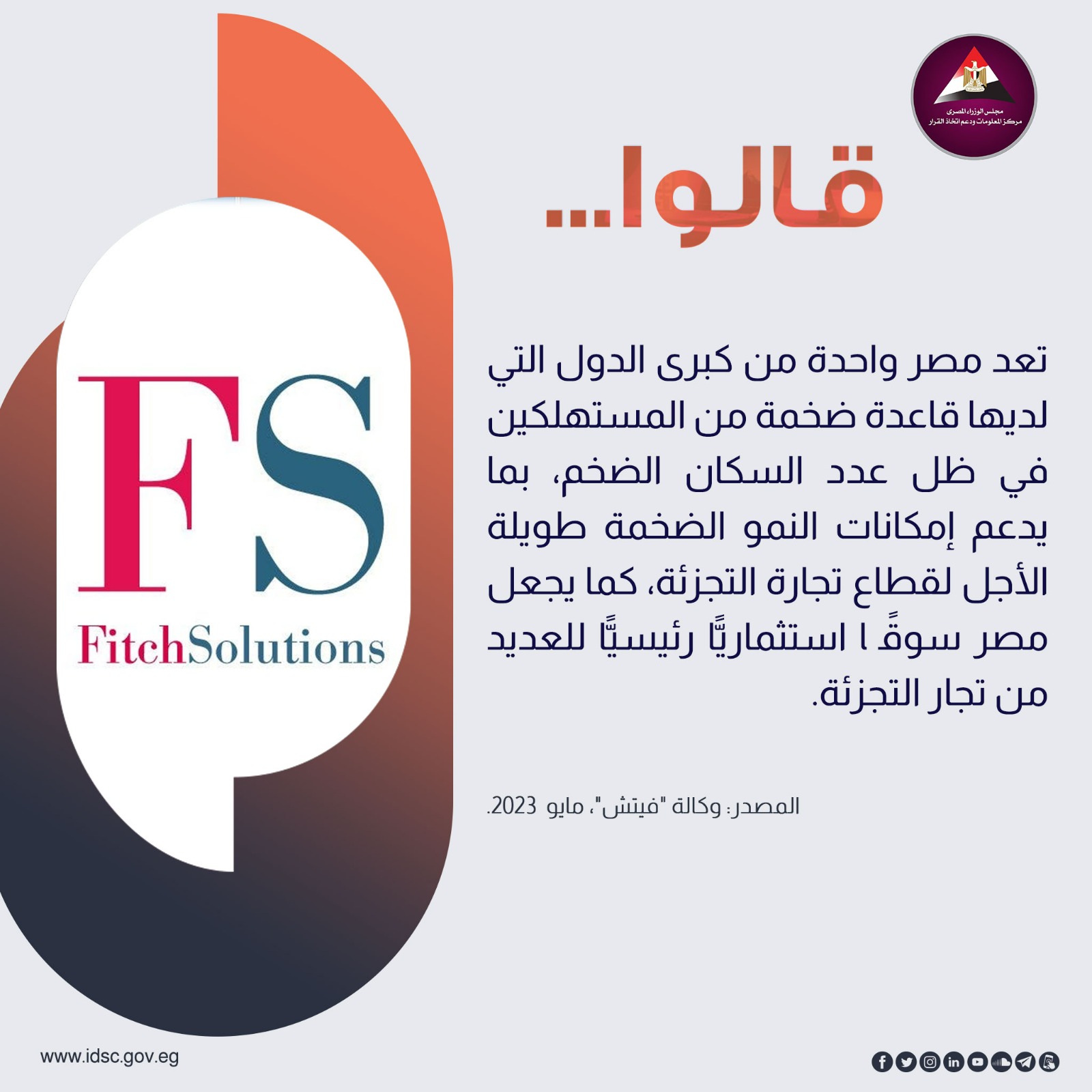 وأفاد المركز الإعلامي لمجلس الوزراء، أن مصر تعد واحدة من كبرى الدول التي لديها قاعدة ضخمة من المستهلكين في ظل عدد السكان الضخم، بما يدعم إمكانات النمو الضخمة طويلة الأجل لقطاع تجارة التجزئة، كما يجعل مصر سوق استثماريا رئيسيا للعديد من تجار التجزئة، وفقًا لوكالة فيتش.