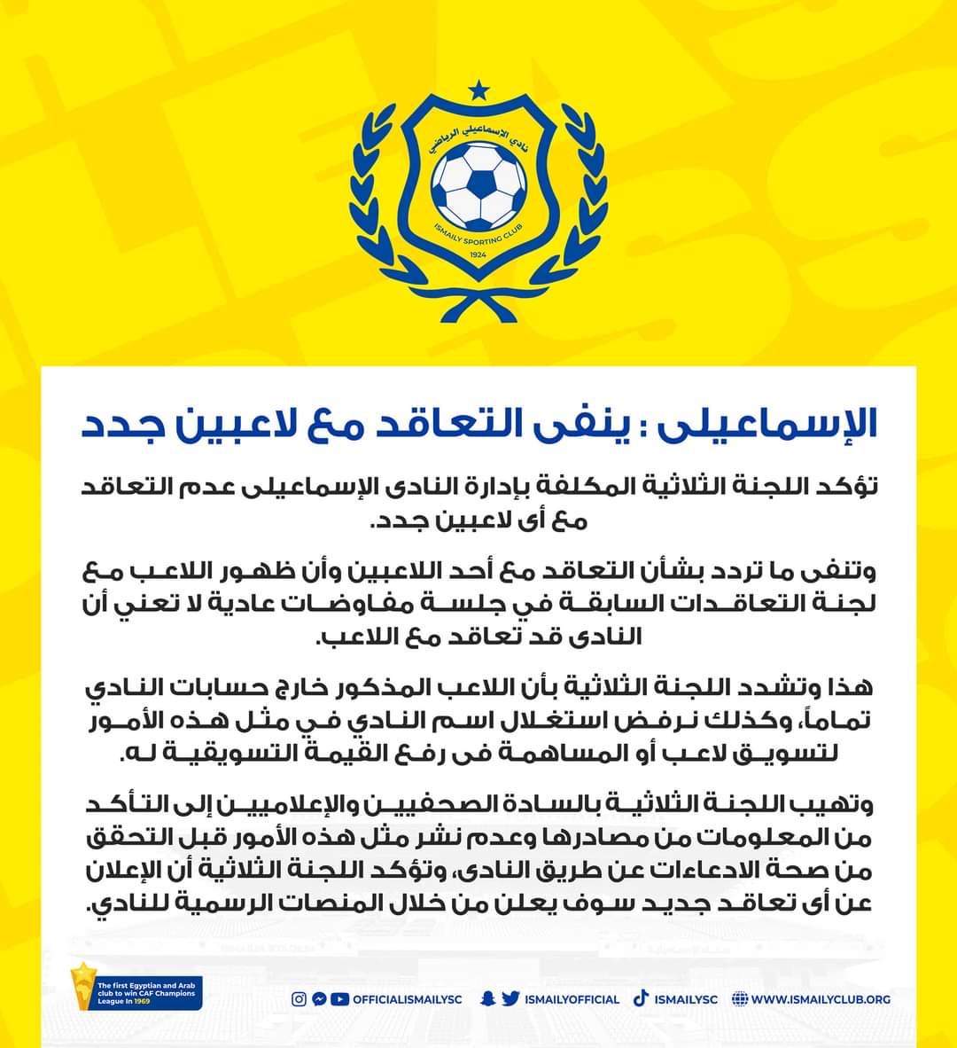 تؤكد اللجنة الثلاثية المكلفة بإدارة النادي الإسماعيلي عدم التعاقد مع أي لاعبين جدد.