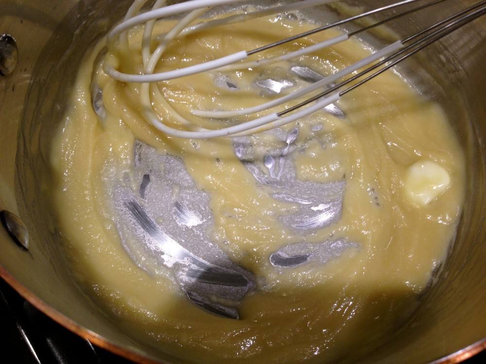 - بعد ذلك يرفع الوعاء من على النار ويوضع اللبن الدافئ بشكل تدريجي مع التقليب بواسطة مضرب البيض.