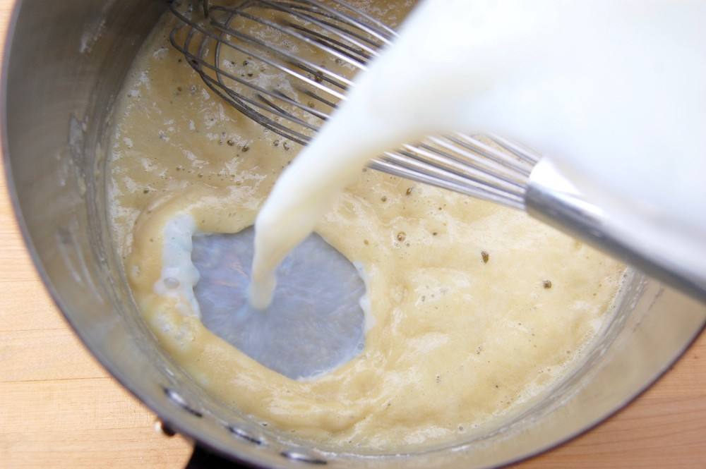 - عند البدء في إضافة اللبن يجب رفع الدقيق من على النار.. على أن يوضع اللبن الدافئ بشكل تدريجي مع التقليب المستمر بواسطة مضرب البيض.