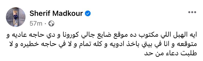 وكتب شريف مدكور منشورًا عبر حسابه الشخصي بموقع التواصل الاجتماعي فيسبوك، حيث قال: إيه الهبل اللي مكتوب ده جالي كورونا، ودي حاجة عادية ومتوقعة وأنا في بيتي بأخذ أدوية وكله تمام ولا في حاجة خطيرة ولا طلبت الدعاء من حد.