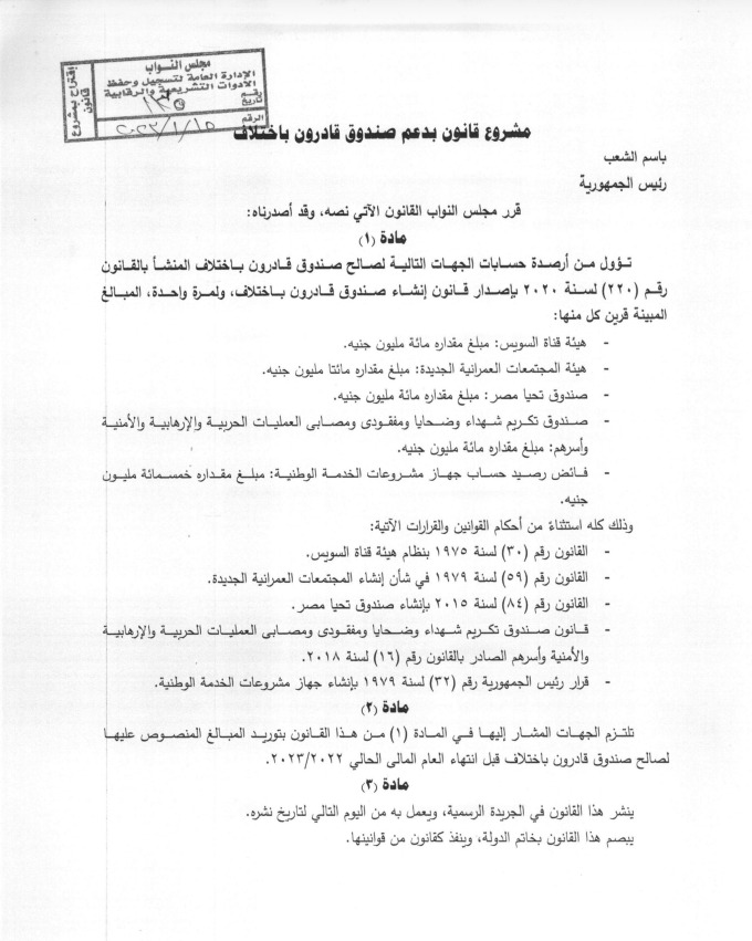 تلتزم الجهات المشار إليها في المادة 1 من هذا القانون بتوريد المبالغ المنصوص عليها لصالح صندوق قادرون باختلاف قبل انتهاء العام المالي الحالي 2022/2023.