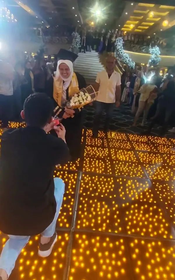 وقالت نادية محمد: تفاجأت بوجود محمد أثناء حفل التخرج، وذلك الأمر تم بعلم والدي، وتقدم لخطبتي أكثر من مرة منذ عدة أشهر، ولكن والدي لم يرد عليه بالموافقة بسبب أنه يسكن في محافظة غير محافظتي، موضحة أنها من محافظة القليوبية والعريس من المنوفية، لتتفاجأ بركوعه وتقديم خاتم الخطبة.