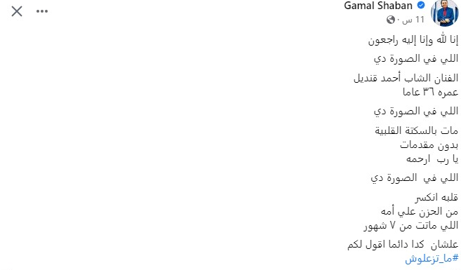 وكتب جمال شعبان منشورًا، عبر حسابه الشخصي بـ فيسبوك، قال فيه: إنا لله وإنا إليه راجعون، اللي في الصورة دي الفنان الشاب أحمد قنديل، عمره 36 عامًا، اللي في الصورة دي مات بالسكتة القلبية، بدون مقدمات، يا رب ارحمه، اللي في الصورة دي قلبه انكسر من الحزن على أمه، اللي ماتت من 7 شهور، عشان كدا دائما أقول لكم متزعلوش.