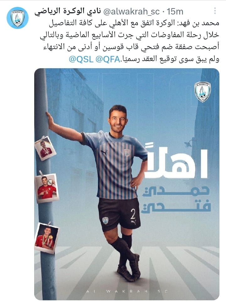 وفي سياق متصل، خلال التغريدات التي تم حذفها، قال نادي الوكرة في بيان رسمي نشره عبر حسابه على موقع التواصل الاجتماعي تويتر منذ قليل: الوكرة اتفق مع الأهلي على كافة التفاصيل خلال رحلة المفاوضات التي جرت الأسابيع الماضية وبالتالي أصبحت صفقة ضم فتحي قاب قوسين أو أدنى من الانتهاء ولم يبق سوى توقيع العقد رسميًا.