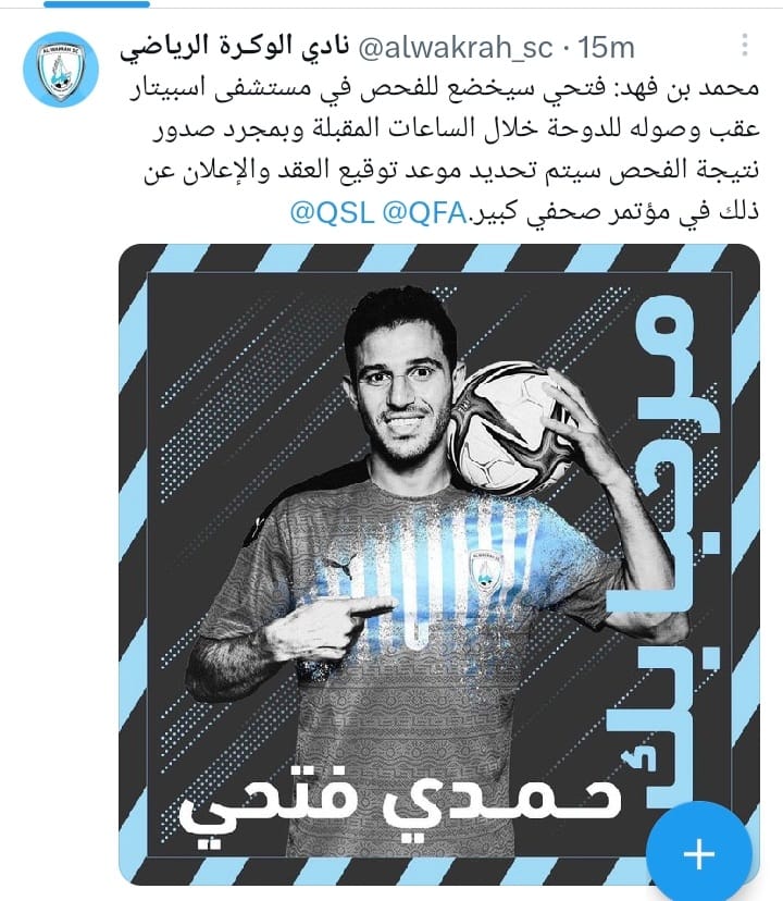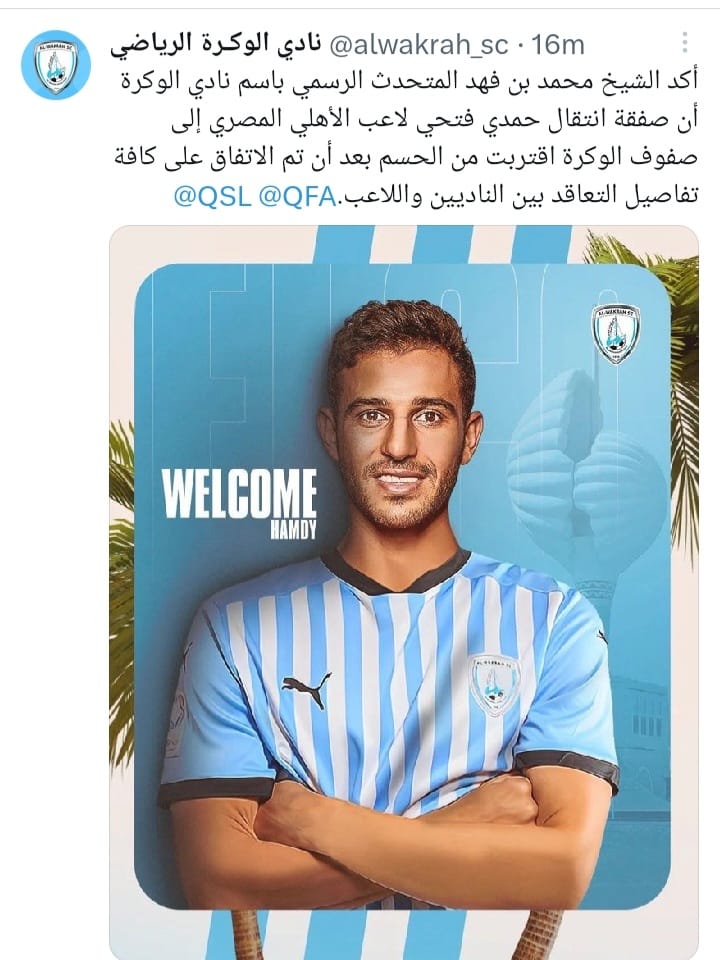 بعد نشرها بدقائق.. حساب الوكرة القطري يحذف تغريدات إعلان التعاقد مع حمدي فتحي