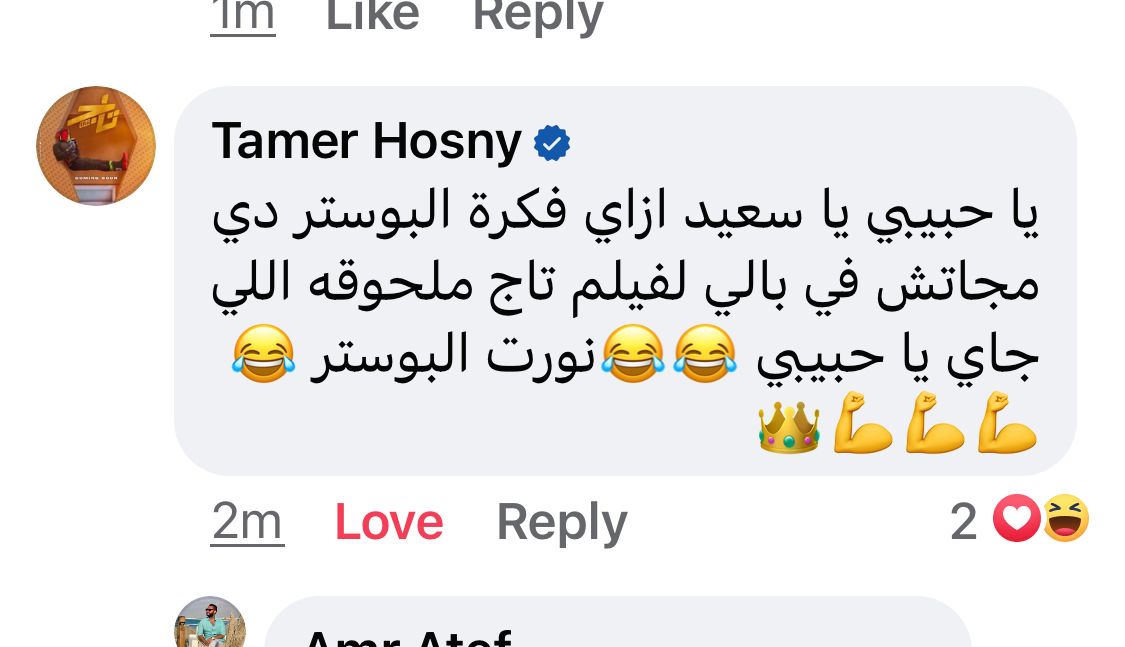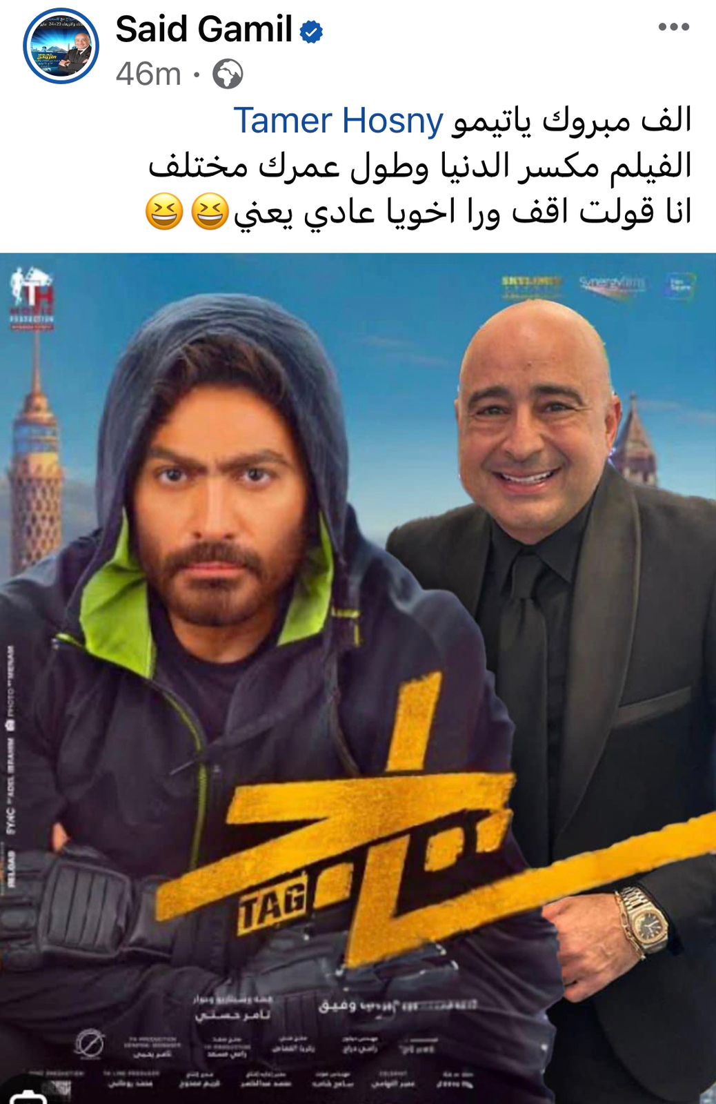 ونشر الإعلامي سعيد جميل صورة له بجانب تامر حسني ببوستر فيلم تاج، وعلق تامر على وجوده في البوستر، قائلًا: يا حبيبي يا سعيد إزاي فكرة البوستر دي مجاتش في بالي لفيلم تاج ملحوقة اللي جاي يا حبيبي.. نورت البوستر.