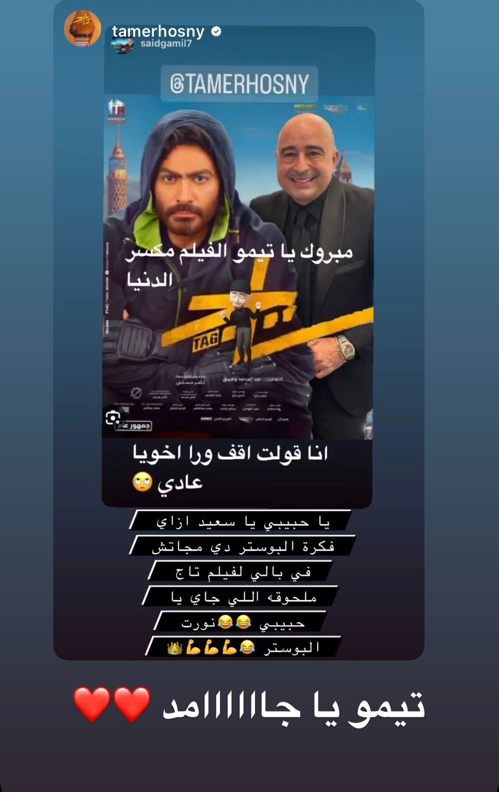 وكتب سعيد جميل على حسابه الرسمي بـ فيس بوك منشورًا، معلقًا فيه: ألف مبروك يا تيمو.. الفيلم مكسر الدنيا وطول عمرك مختلف، أنا قولت أقف ورا أخويا عاد يعني.