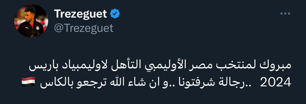 وعلق تريزيجيه على صفحته: مبروك لمنتخب مصر الأولمبي التأهل لأولمبياد باريس 2024.. رجالة شرفتونا.. وإن شاء الله ترجعوا بالكاس.