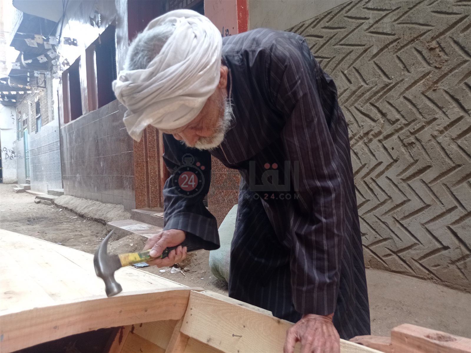 في حارة ضيقة يجلس أمام منزله، ليستريح قليلًا من الطرق على سطح قارب صيد خشبي يعمل على تصنيعه منذ 3 أيام، وحوله قطع خشبية يستخدمها لاستكمال عمله في صناعة القارب، وبجواره أحد أبنائه الخمسة والوحيد الذي تعلم منه تلك المهنة التي قاربت على الاندثار.