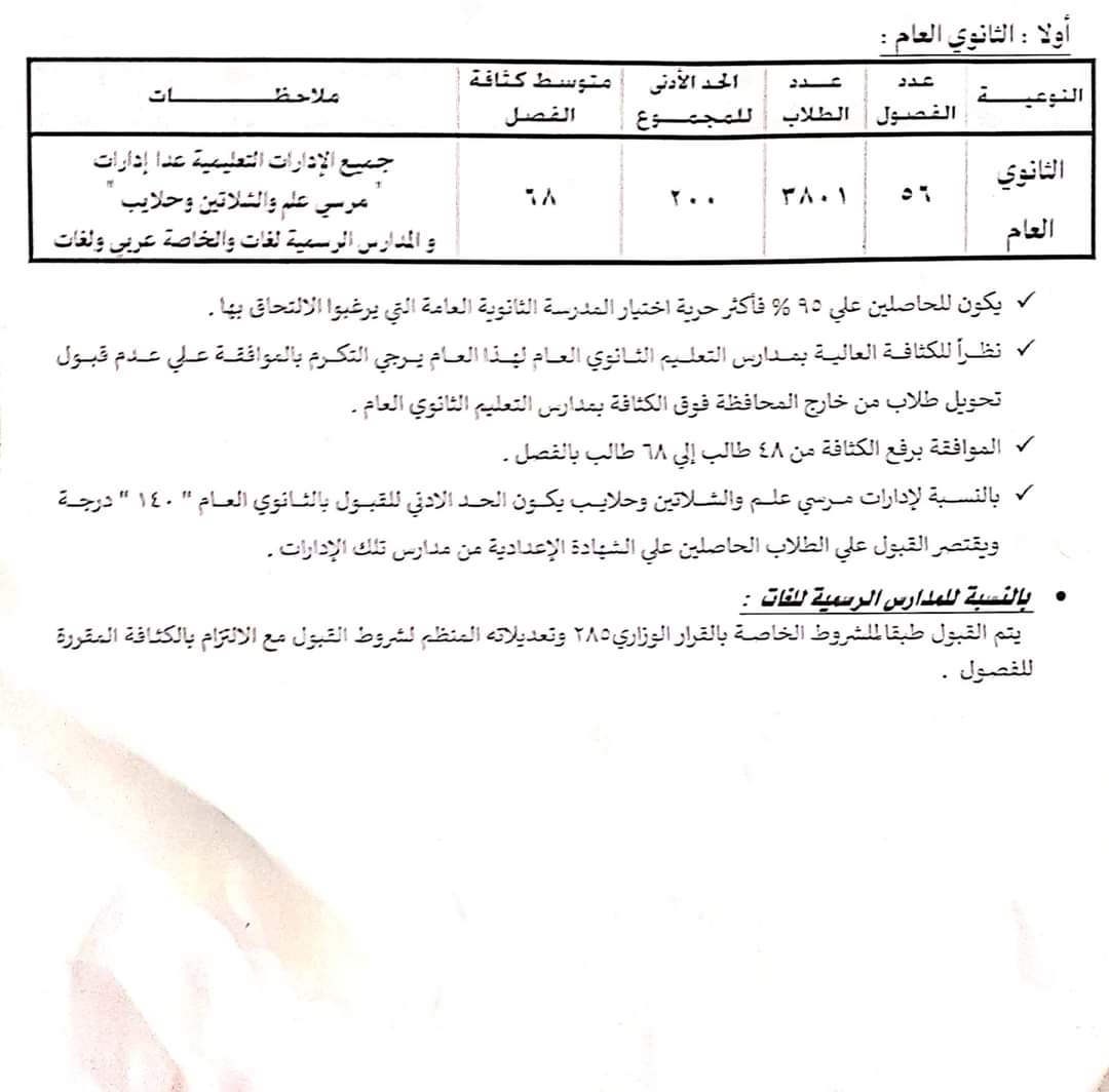 وجاء تنسيق القبول في مدارس الثانوي العام من 200 درجة، بجميع الإدارات التعليمية عدا مرسى علم وحلايب وشلاتين والمدارس الرسمية لغات والخاصة عربي ولغات.