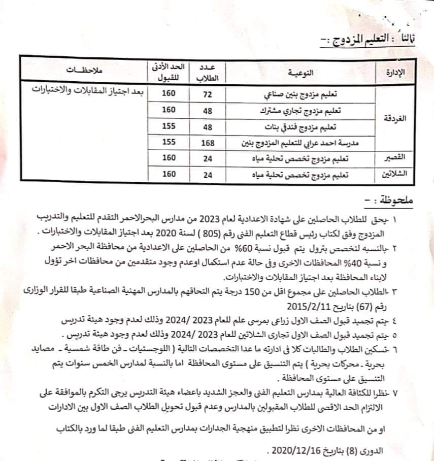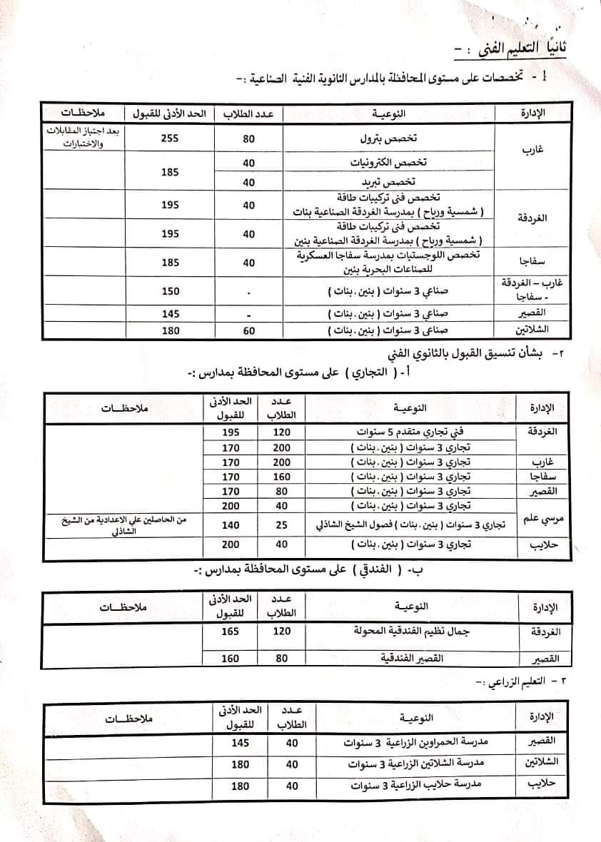 وكذلك فني تجارى نظام الـ 5 سنوات بالغردقة من 195 درجة وجميع الإدارات الأخرى التجاري نظام 3 سنوات والفندقي 3 و5 سنوات من 150 درجة، وقبول الطلاب بمدرسة الحمروين الزراعية بالقصير من 145 درجة.