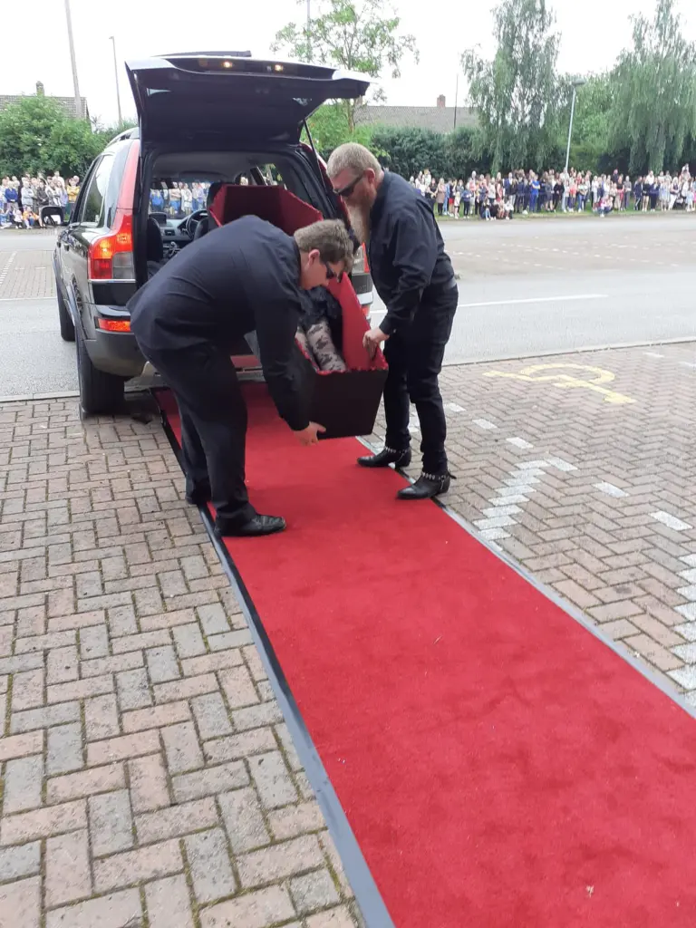 انتشر فيديو لـ مراهقة بريطانية، تصل إلى حفل التخرج في مدرستها خلال وجودها في نعش يحمله شقيقها ووالدها.