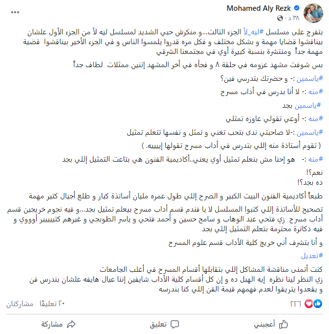 ونشر محمد علي رزق، عبر حسابه الشخصي على موقع فيس بوك، منشورًا، ينتقد من خلاله مؤلفين مسلسل ليه لأ الجزء الثالث، بسبب مشهد تحدث فيه أحد الأبطال في العمل عن كلية الآداب قسم مسرح، إذ قالت ضمن أحداث العمل: هو إحنا مش بنعلم تمثيل أوي يعني..أكاديمية الفنون هي بتاعت التمثيل اللي بجد.