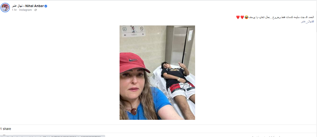 ونشرت نهال عنبر، صورة لحفيدها يوسف عبر حسابها الشخصي بموقع التواصل الاجتماعي فيسبوك، وعلقت قائلة: الحمد لله جات سليمة، كدمات فقط وجروح.. مش تبطل شقاوة يا يوسف.