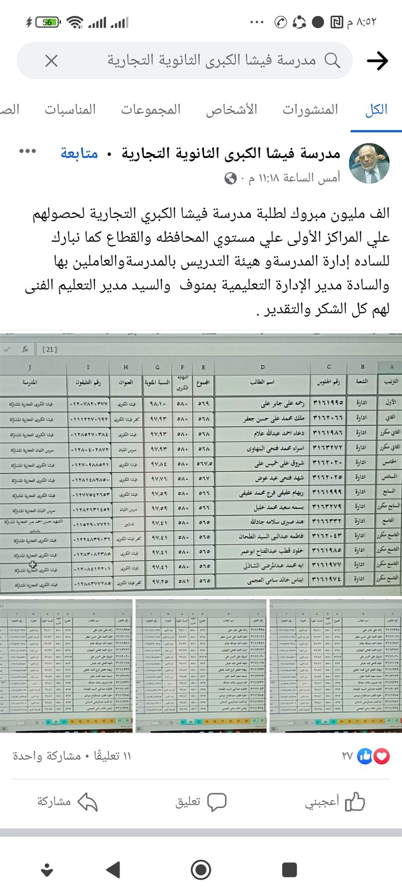 وتداول عدد من مستخدمي موقع التواصل الاجتماعي فيس بوك ورقة أوائل الدبلوم التجاري، التي حملت وجود 10 من الأوائل في القائمة على مستوى محافظة المنوفية.