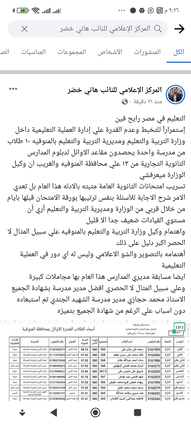 منشور النائب هاني خضر حول وجود 10 من أوائل الدبلوم التجاري من مدرسة واحدة بالمنوفية