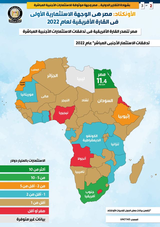 نشر المركز الإعلامي لـ مجلس الوزراء تقريرًا تضمن إنفوجرافات تسلط الضوء على تقرير مؤتمر الأمم المتحدة للتجارة والتنمية - الأونكتاد - الذي يؤكد أن مصر هي الوجهة الاستثمارية الأولى في القارة الإفريقية لعام 2022، كما أبرزت أن مصر وجهة استثمارية موثوقة بشهادة التقارير الدولية.