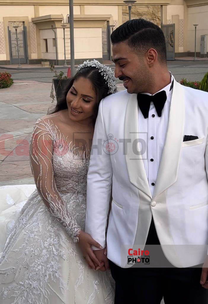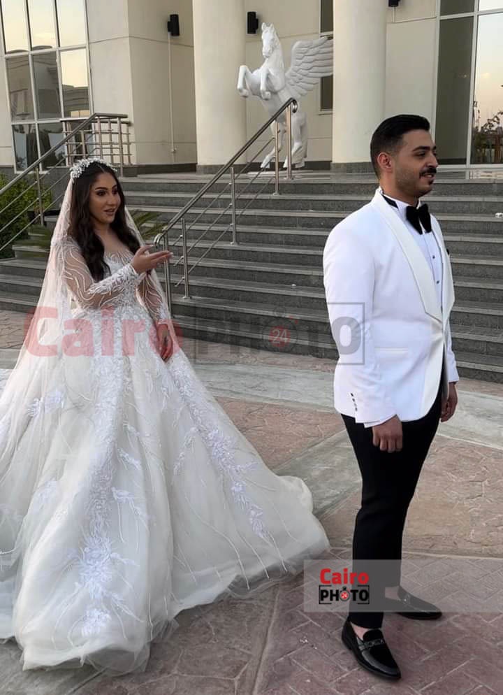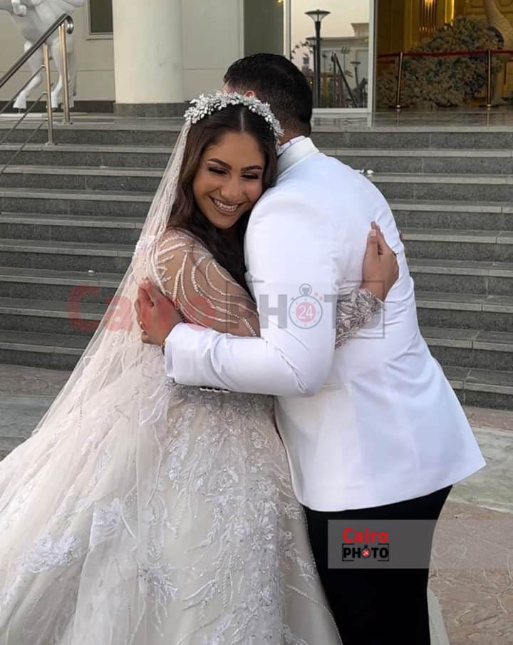 واعتمدت ياسمينا علواني مكياجا هادئا مع شعر منسدل على الكتفين برفقة الطرحة البيضاء والفستان الأبيض، وحرص زوجها على ارتداء اللون الأبيض أيضا في البليزر والقميص.