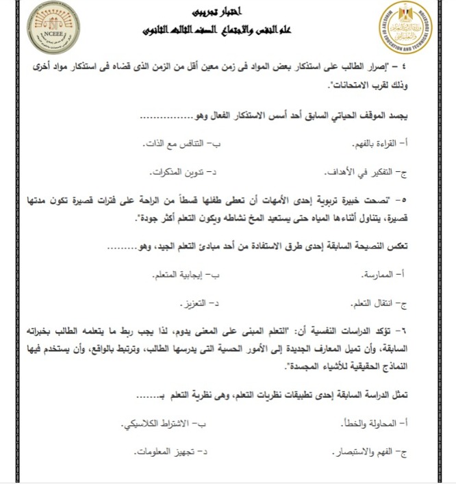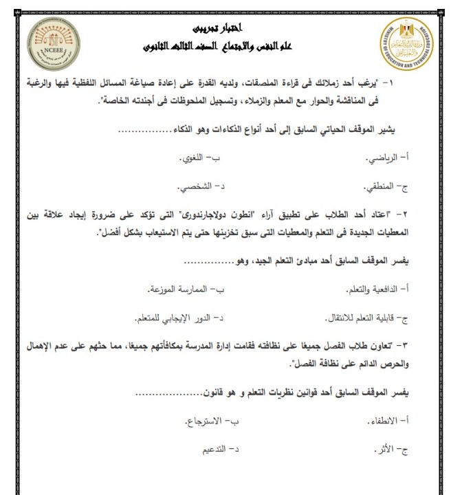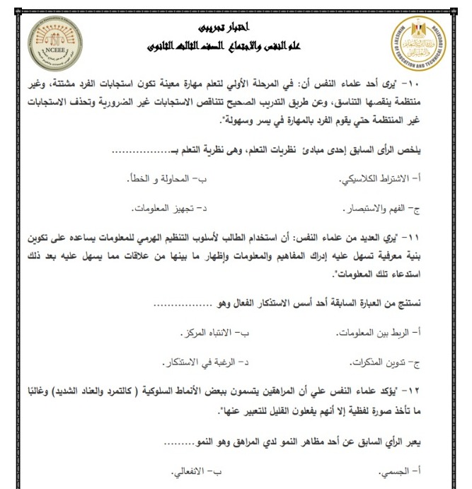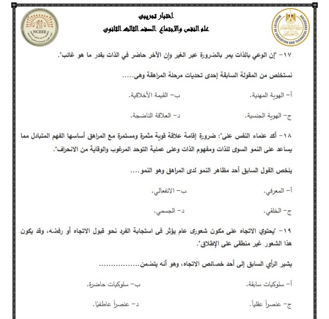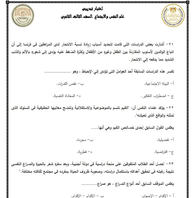 ويمكن لطلاب الثانوية العامة 2023 الشعبة الأدبية تحميل نموذج اختبار تجريبي لمادة علم النفس والاجتماع الصف الثالث الثانوي، حيث يعتبر النموذج مقدم من وزارة التربية والتعليم والتعليم الفني ويحتوي على أسئلة 50 سؤالًا لـ إفادة الطلاب قبل بدء الامتحان.