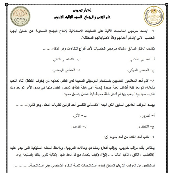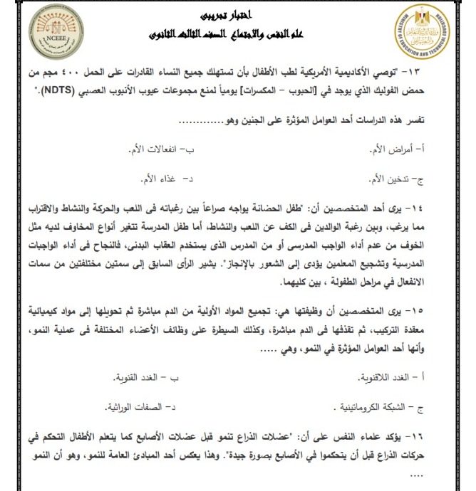 امتحان علم النفس لطلاب الثانوية العامة 2023
