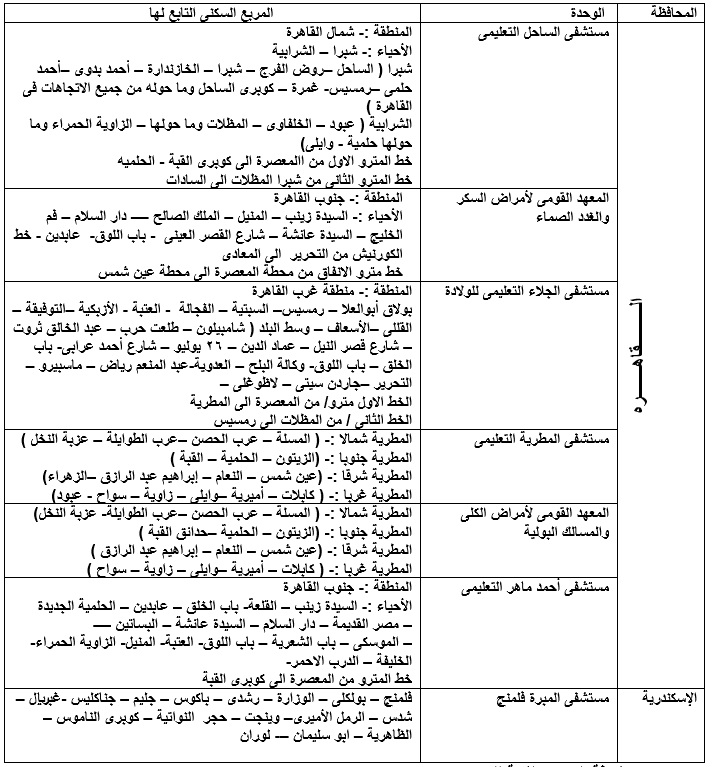 نشرت الهيئة العامة للمستشفيات والمعاهد التعليمية قائمة بالمستشفيات والمعاهد في جميع المحافظات، والمربع السكني التابع لها، وجاءت كالتالي: