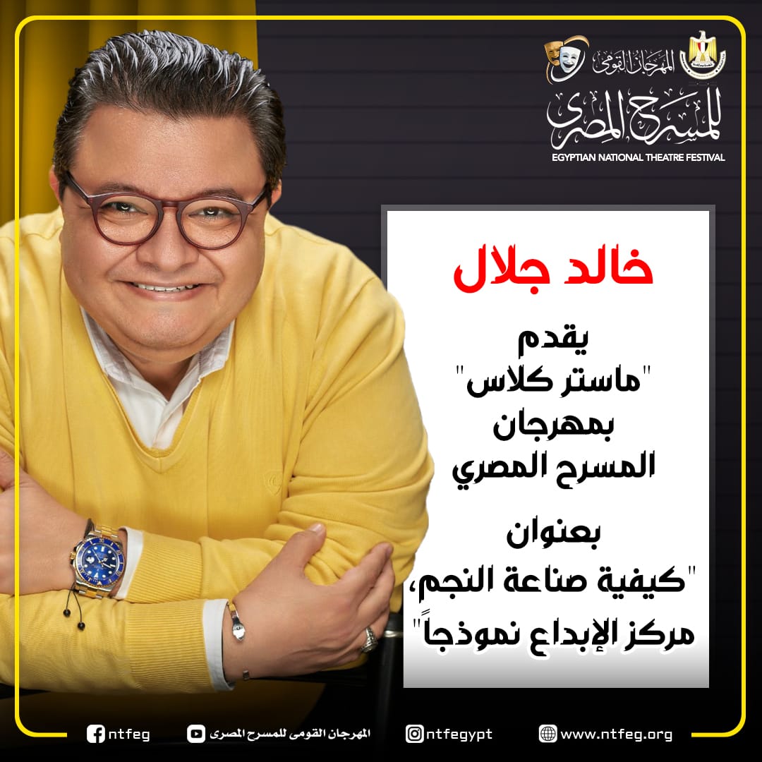 يقدم المهرجان القومي للمسرح المصري في دورته السادسة عشرة، برئاسة الفنان محمد رياض، ولأول مرة، ماستر كلاس للفنان والمخرج خالد جلال، تحت عنوان: كيفية صناعة النجم.. مركز الإبداع نموذجا.