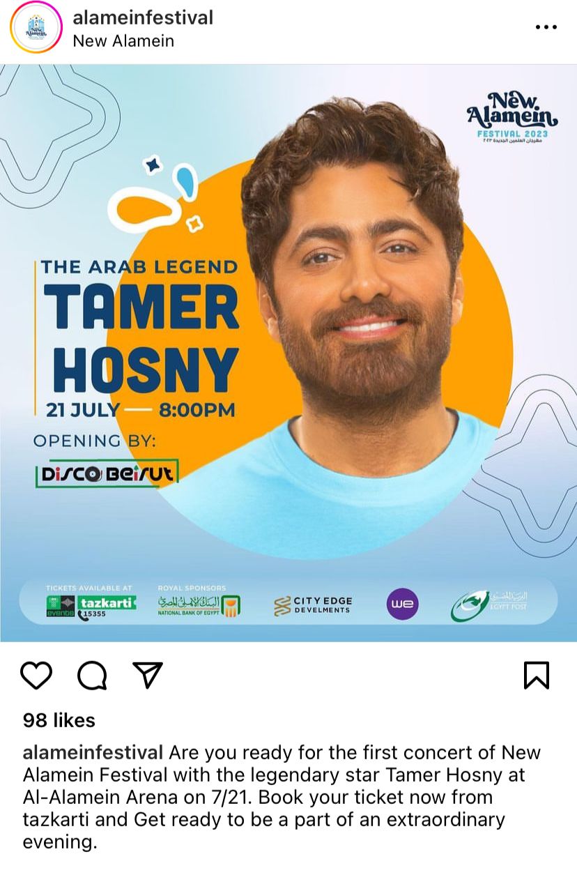 ومن ضمن فعاليات مهرجان العلمين، إحياء الفنان تامر حسني، حفلًا هناك، يوم الجمعة الموافق 21 يوليو، ونشرت الصفحة الرسمية لقناة DMC، على موقع انستجرام، البرومو الرسمي للحفل، وضم البرومو عدد من اللقطات الخاصة بمدينة العلمين، وكذلك لقطات من حفلات سابقة للفنان تامر حسني؛ تشويقًا للجمهور.