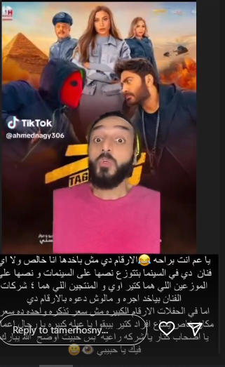 وأعاد تامر حسني نشر فيديو أحد الأشخاص، عبر حسابه الرسمي بموقع الصور والفيديوهات إنستجرام، وعلق عليه قائلًا: يا عم انت براحه، الأرقام ديه مش باخدها أنا خالص ولا أي فنان، ديه في السينما بتتوزع نصها على السينمات، ونصها على الموزعين اللي هما كتير أوي، والمنتجين اللي هما 4 شركات، الفنان بياخد أجره ولمهوش دعوة بالأرقام ديه.