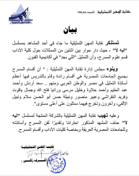 وتابع البيان: وعليه تهيب نقابة المهن التمثيلية بالشركة المنتجة لمسلسل ليه لأ إلى حذف المشهد المذكور احترامًا وتقديرًا لفن المسرح وأساتذته وللجامعات المصرية العريقة وبخاصة كليات الآداب وأقسام المسرح.