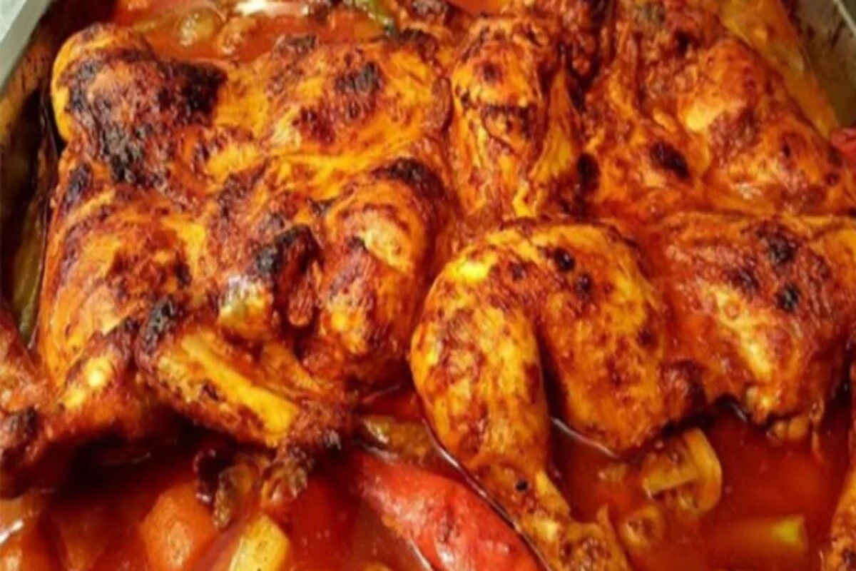 أخرجي الدجاج من الشوربة وضعيه في صينية فرن دون تصفيته تماما من الشوربة ورشي عليه قليل الملح والفلفل الأسود واتركيه يحمر وجهه في الفرن.