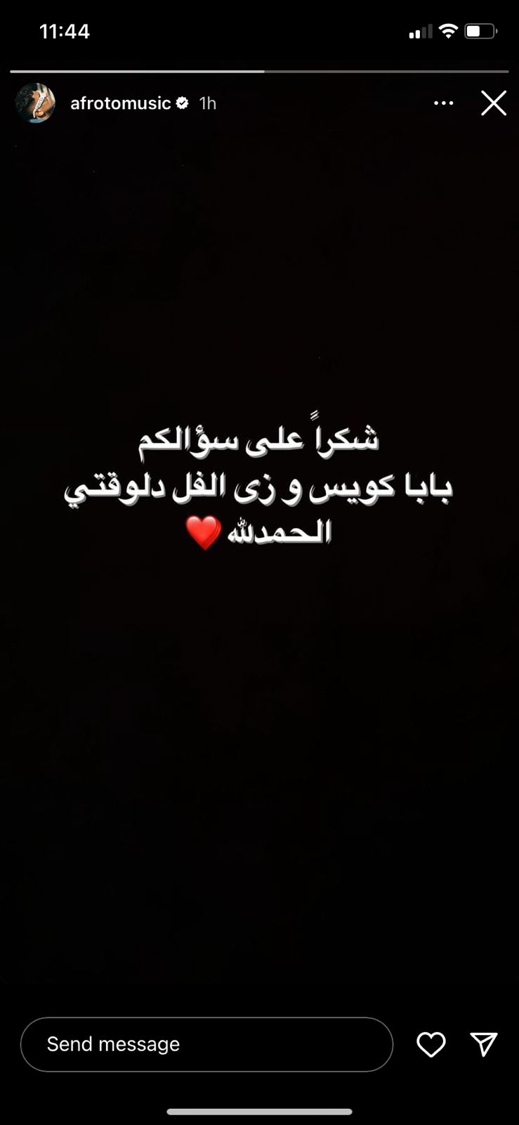 كتب عفروتو، منشورًا عبر حسابه الشخصي بموقع إنستجرام، جاء فيه: شكرًا على سؤالكم، بابا كويس وزي الفل دلوقتي، الحمد لله.