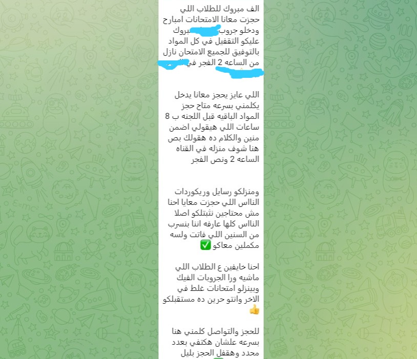 وأضاف الأدمن في رسالته للطلاب، بشأن سرعة الحجز: اللي عايز يحجز معانا يدخل يكلمني بسرعة، متاح حجز المواد الباقية قبل اللجنة بـ8 ساعات، واللي هيقول لي اضمن منين والكلام ده هقولك بص هنا شوف منزله في القناة الساعة 2 ونص الفجر".