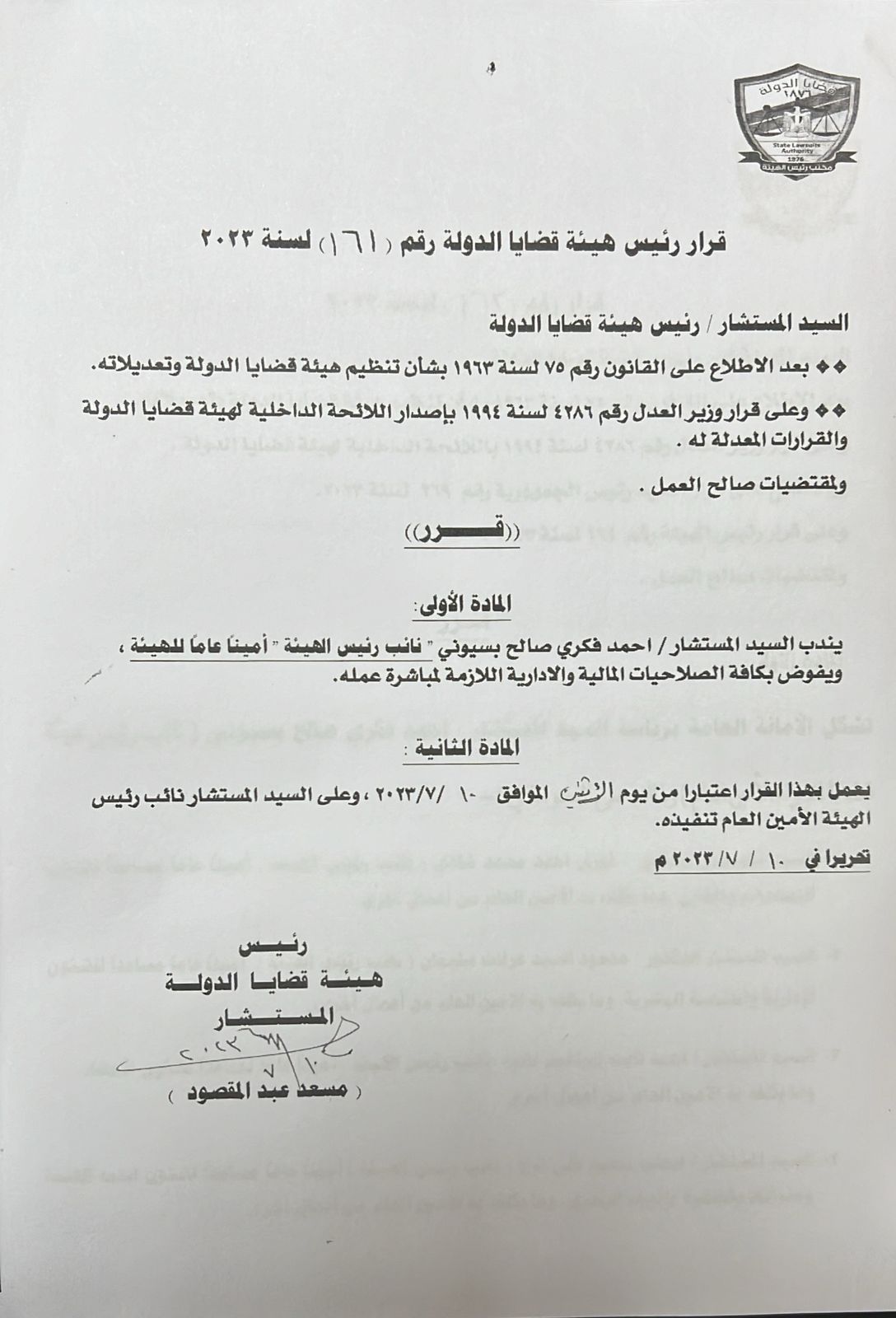 أصدر المستشار مسعد عبد المقصود بيومي، رئيس هيئة قضايا الدولة اليوم الاثنين الموافق 10 يوليو 2023، القرار رقم 161 لسنة 2023 بندب المستشار أحمد فكري صالح بسيوني نائب رئيس الهيئة أمينا عاما للهيئة.