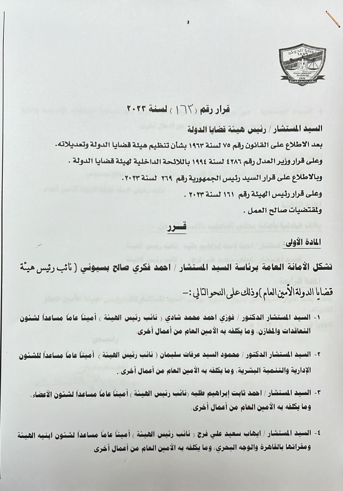 كما أصدر رئيس هيئة قضايا الدولة، القرار رقم 163 لسنة 2023 بتشكيل الأمانة العامة للهيئة برئاسة المستشار أحمد فكري صالح بسيوني نائب رئيس هيئة