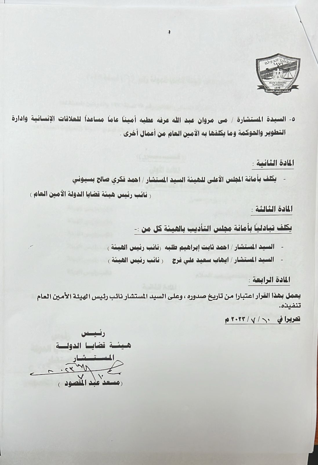 كما أصدر المستشار مسعد عبد المقصود بيومي القرار رقم 164 لسنة 2023 بتشكيل المجلس الأعلى للهيئة، حيث يكلف بأمانة المجلس الأعلى للهيئة المستشار أحمد فكري صالح بسيوني، نائب رئيس هيئة قضايا الدولة الأمين العام، ويكلف تبادليا بأمانة مجلس التأديب بالهيئة كل من: المستشار أحمد ثابت إبراهيم طلبة نائب رئيس الهيئة، المستشار إيهاب سعيد علي فرج نائب رئيس الهيئة، ويعمل بهذا القرار اعتبارا من تاريخ صدوره، وعلى المستشار نائب رئيس الهيئة الأمين العام تنفيذه.