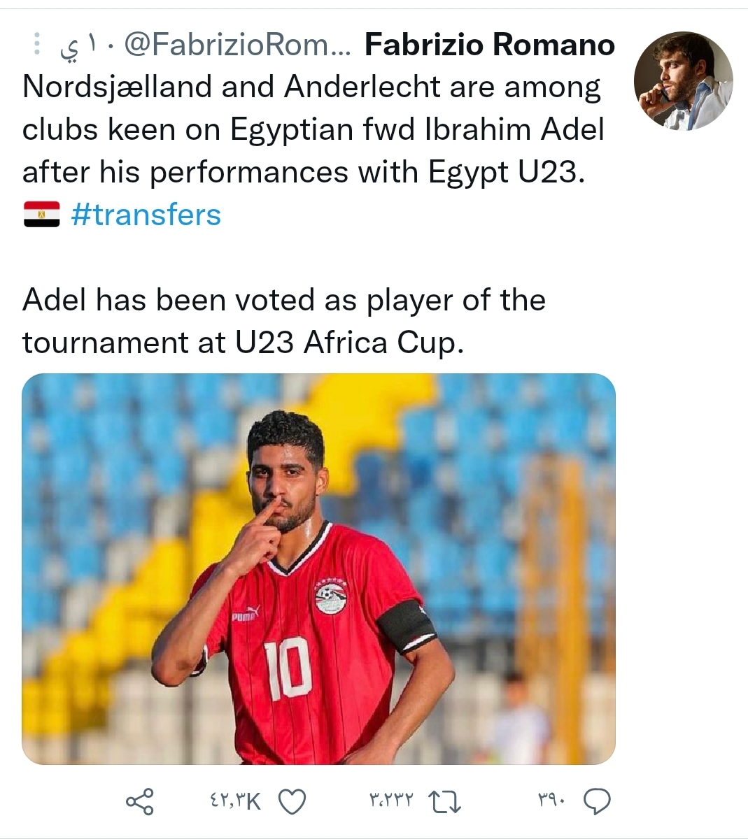 ومن جانبه، نشر الإعلامي الإيطالي فابريزيو رومانو، عبر حسابه الشخصي على موقع التواصل الاجتماعي تويتر، بما يفيد أن الثنائي الأوروبي نورشيلاند الدنماركي وآندرلخت البلجيكي لديهما اهتمام بالتعاقد مع إبراهيم عادل قائد منتخب مصر الأولمبي، وذلك بعد أن تألق في بطولة أمم إفريقيا تحت 23 سنة بالمغرب، وحصل على جائزة أفضل لاعب بها لافتًا كافة الأنظار إليه.