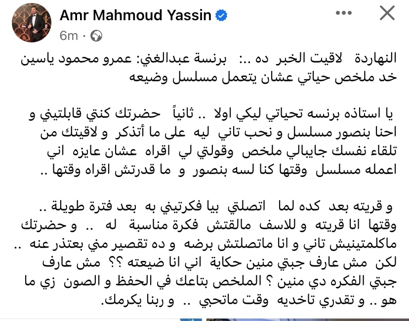 وكتب عمرو محمود ياسين، منشورًا عبر حسابه الشخصي بموقع التواصل الاجتماعي فيسبوك، وقال: يا أستاذة برنسة تحياتي ليكي أولا، ثانيًا حضرتك كنتي قابلتيني وإحنا بنصور مسلسل ونحب تاني ليه، على ما أتذكر ولاقيتك من تلقاء نفسك جايبالي ملخص، وقولتي لي اقراه عشان عايزة إني أعمله مسلسل وقتها كنا لسه بنصور وما قدرتش أقراه وقتها.