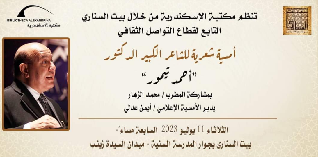 تنظم مكتبة الإسكندرية من خلال بيت السناري التابع لقطاع التواصل الثقافي، أمسية شعرية مفتوحة للجمهور تحت عنوان قليل من الحب لا يصلح للشاعر الكبير الدكتور أحمد تيمور عضو المجمع العلمي المصري، وذلك يوم الثلاثاء 11 يوليو، في تمام السابعة مساء، بمقر بيت السنارى الأثري بالسيدة زينب، بالقاهرة.