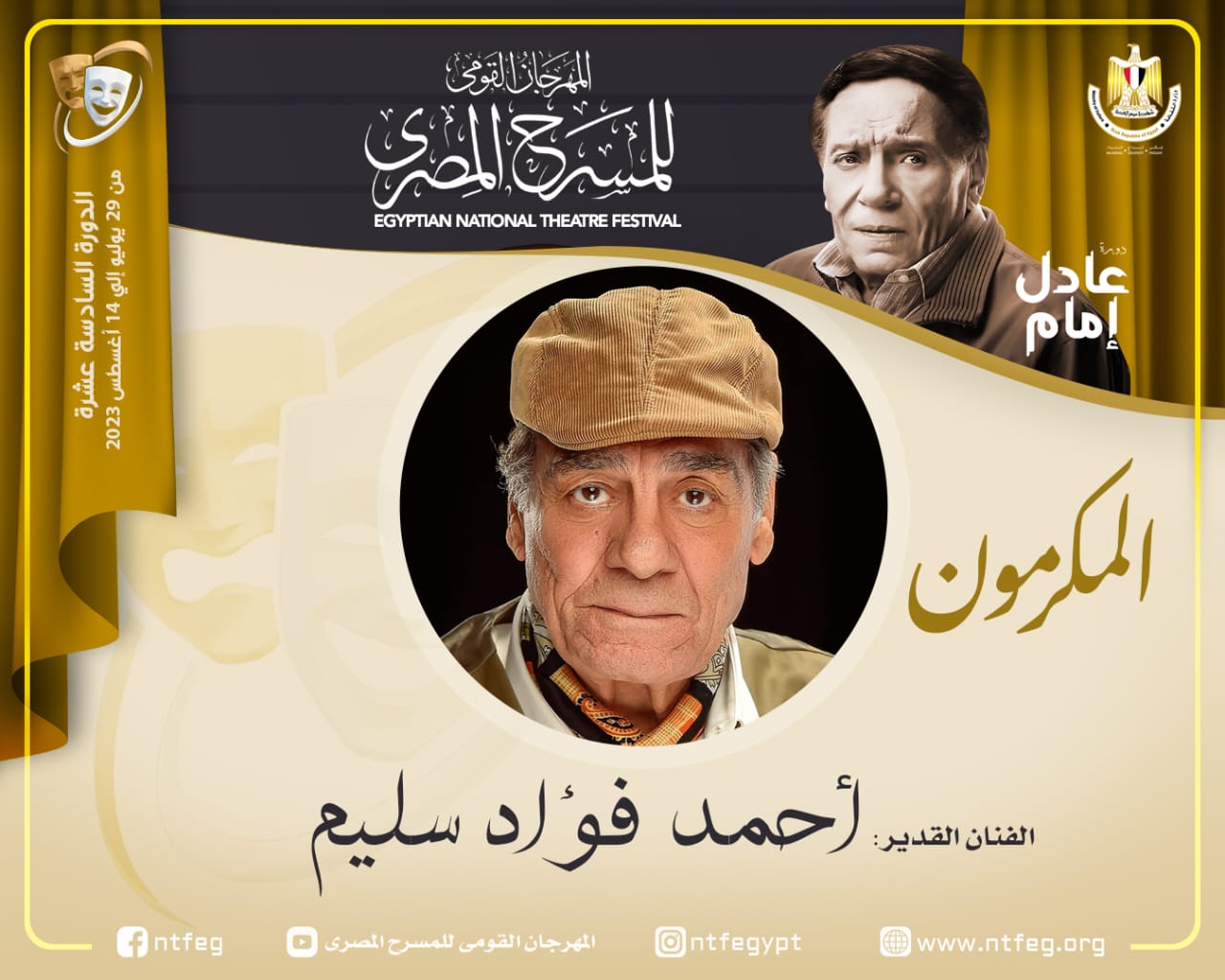 ونشرت صفحة المهرجان القومي للمسرح المصري، على موقع التواصل الاجتماعي فيس بوك، بوستر تكريم أحمد فؤاد سليم، وعلقت: مهرجان المسرح المصري يكرم الفنان أحمد فؤاد سليم في دورته السادسة عشرة.