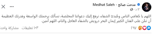 وكتب مدحت صالح منشورًا عبر حسابه الرسمي بموقع فيس بوك، داعيًا للفنان إيمان البحر درويش، وقال: اللهم يا مُعافي الناس ومُبدئ الشفاء، نرفع إليك دعواتنا المخلصة، نسألك برحمتك الواسعة وقدرتك العظيمة أن تمُن على الفنان الكبير إيمان البحر درويش بالشفاء العاجل والتام، اللهم آمين.