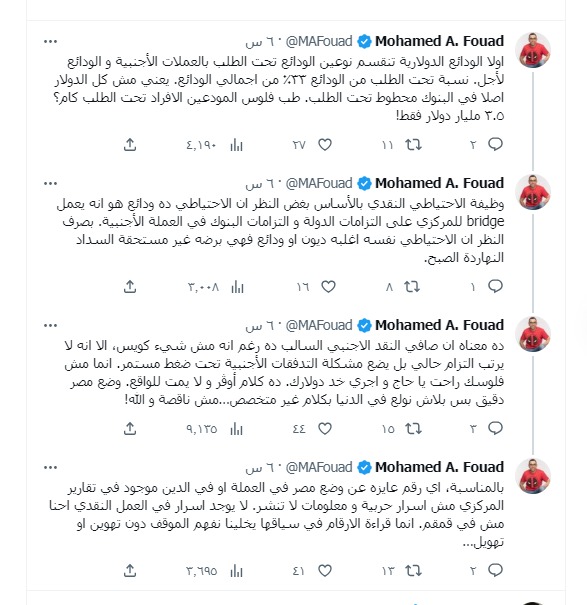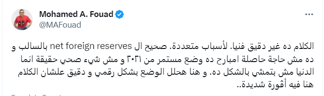 وقال فؤاد في رده: الكلام ده غير دقيق فنيا، لأسباب متعددة صحيح الـ net foreign reserves بالسالب وده مش حاجة حاصلة إمبارح ده وضع مستمر من 2021 ومش شيء صحي بالفعل، إنما الدنيا مش بتمشي بالشكل ده، وهنا هحلل الوضع بشكل رقمي ودقيق علشان الكلام هنا فيه أڤورة شديدة.