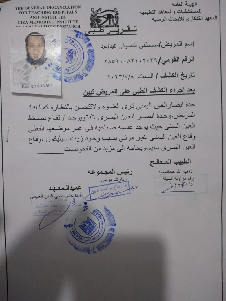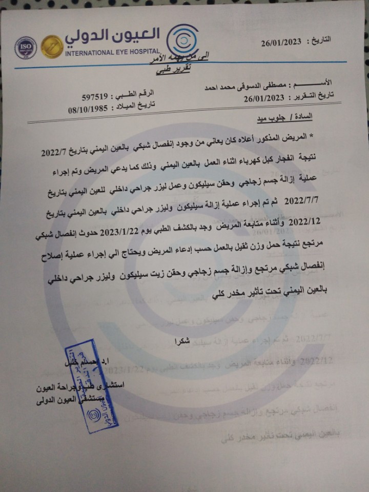 وواصل مصطفى دسوقي محمد، قائلا: بعد رجوعي للعمل شعرت بوجود غمامة في عيني، والدكتور قالي إن الغمامة حدثت بسبب تجدد انفصال الشبكية نتيجة الإرهاق، وبعدها أجريت عدة عمليات منها زرع عدسة وإزالة المياه البيضاء وزيت السيلكون، لكن لم يفيد ذلك في تحسين حالة عيني.